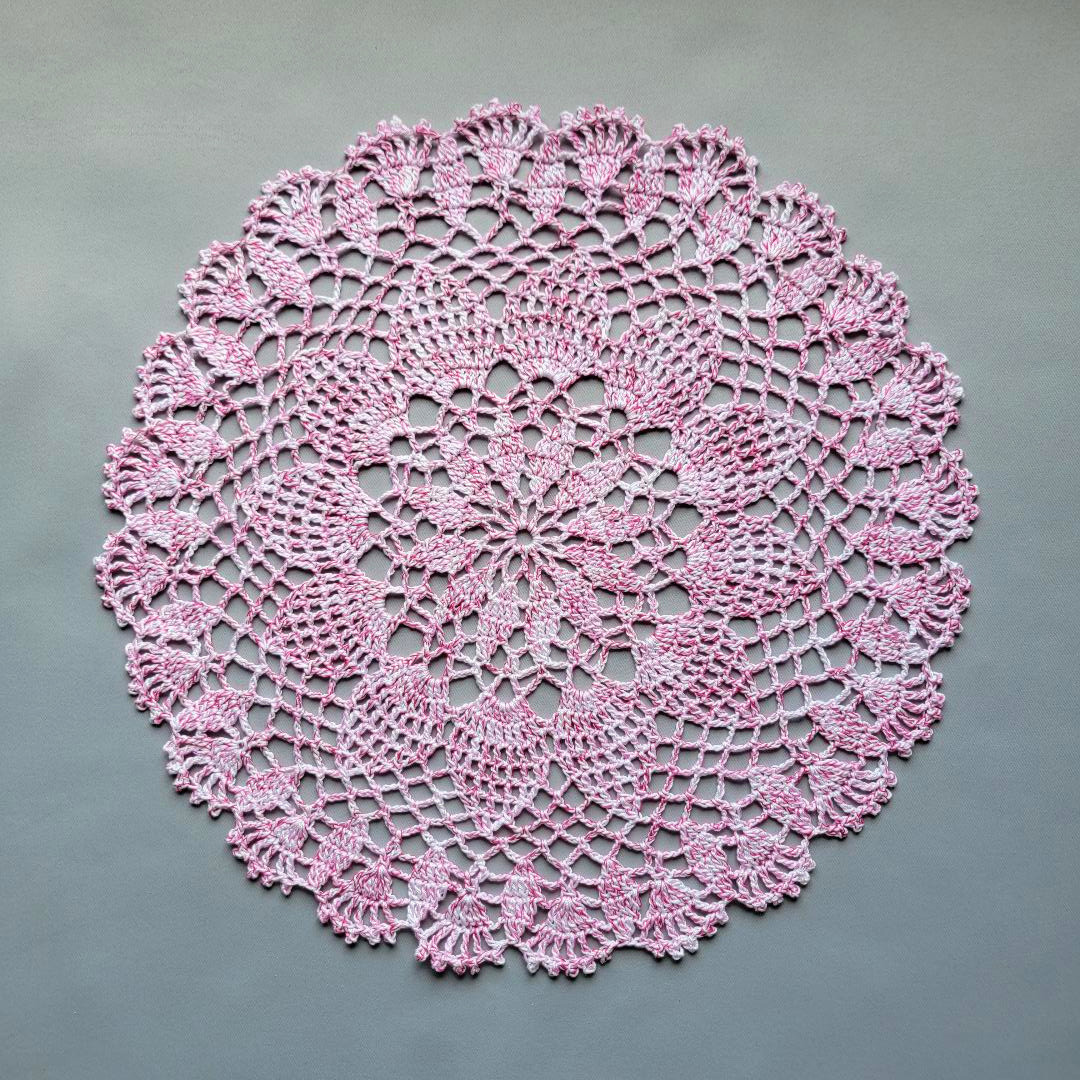The doily was crocheted in white. The added thread is a variegated pink cotton.