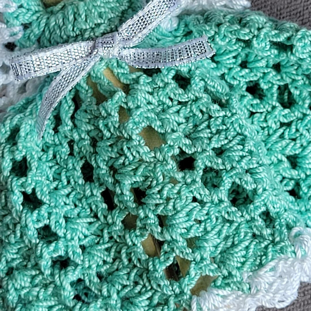 This angel was handmade with 100% Mercerized Cotton and adorned with a pretty bow.