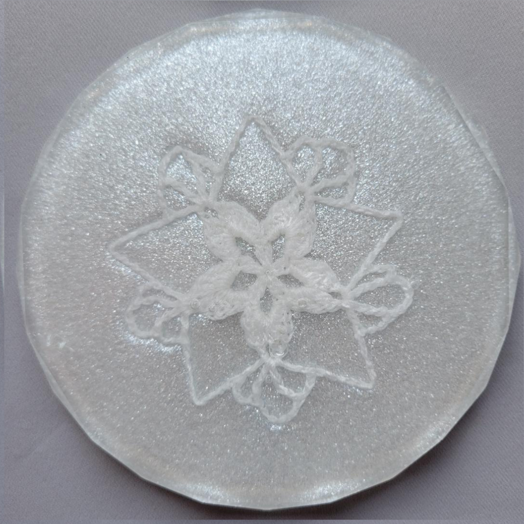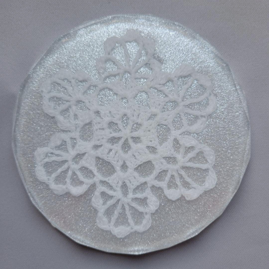 It's a bit of crochet saved in resin for all to see! This coaster set was made with the help of resin artist Janice from Jan's Resin Art.