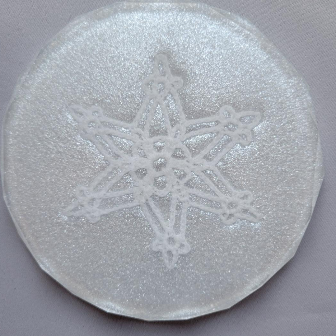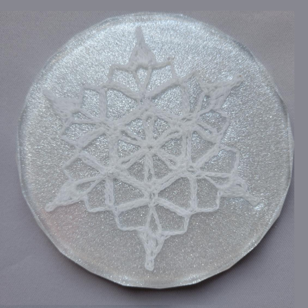 The Blizzard Coaster Set was crocheted using 100% mercerized crochet cotton thread and stiffened using cornstarch. It was then placed in resin with added glitter for some sparkly fun!