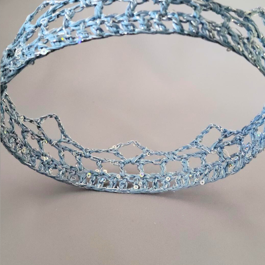 Each crown is crocheted with two strands of mercerized crochet cotton thread or a thread/metallic mix, and a strand of lycra/sequins.